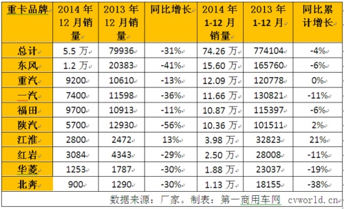 行業(yè)資訊剛剛過去的2014年12月, 重卡市場比11月份更加慘淡。第一商用車網(wǎng)記者最新獲悉,2014年12月重卡行業(yè)共約銷車5.5萬輛,同比大幅下降31%(11月份的同比降幅為18%),環(huán)比只微增了2%。這個數(shù)值,還未達(dá)到最近五年來(2010-2014年)的12月份銷量平均值。