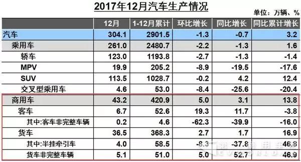 2017年12月商用車產(chǎn)銷數(shù)據(jù)出爐!2018年1月11日,中汽協(xié)發(fā)布2017年12月汽車產(chǎn)銷數(shù)據(jù)。2017年12月,汽車生產(chǎn)304.14萬輛,環(huán)比下降1.26%,同比下降0.70%;銷售306.03萬輛,環(huán)比增長3.47%,同比增長0.10%。其中,商用車生產(chǎn)43.18萬輛,環(huán)比增長5%,同比增長3.11%;銷售40.70萬輛,環(huán)比增長10.56%,同比增長5.70%。