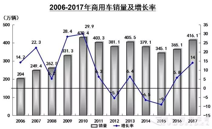 2017年,汽車產(chǎn)銷2901.54萬輛和2887.89萬輛,同比增長3.19%和3.04%,增速比上年同期回落11.27個百分點(diǎn)和10.61個百分點(diǎn)。其中,商用車產(chǎn)銷420.87萬輛和416.06萬輛,同比增長13.81%和13.95%。