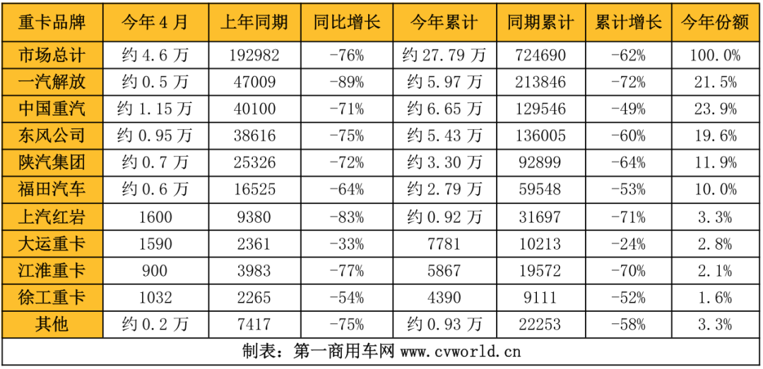 4月份過(guò)后,2022年1-4月的重卡市場(chǎng)累計(jì)實(shí)現(xiàn)銷(xiāo)售27.8萬(wàn)輛,比上年同期的72.5萬(wàn)輛下降62%,減少了44.7萬(wàn)輛之多!